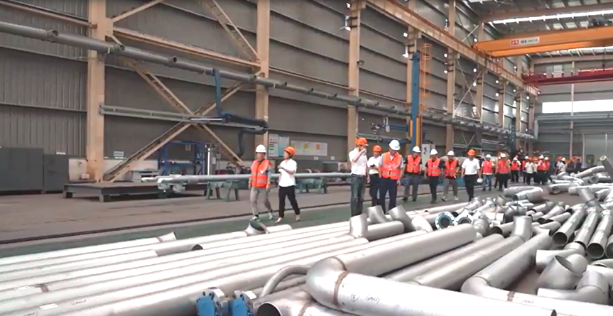 下午與會人員參觀了金童裝備公司的管道預制自動化生產線和二期新石化高端裝備研發(fā)和制造項目建設工地,并對中石油廣西乙烯項目在制的合金鋼預制管道進行了材料追溯審核和質量控制的檢查和交流。