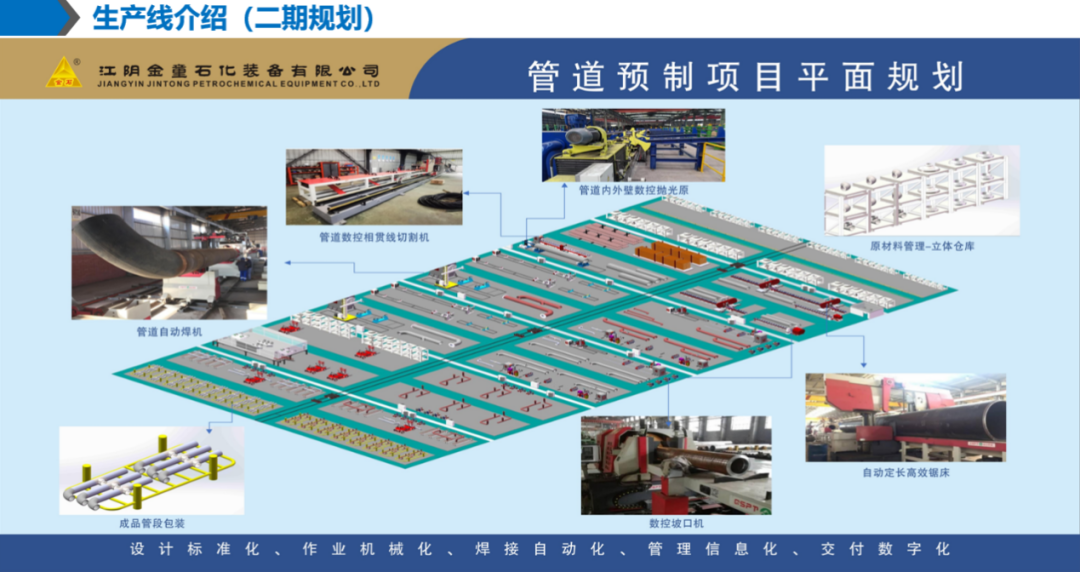 作為管道預制工廠化的實施主體之一,金童裝備公司三年前進行了戰(zhàn)略布局,相繼投入4億元,規(guī)劃建設了占地面積近40000㎡的智能制造示范性工廠,并計劃于2024年底全面建成,屆時集設計標準化、采購集約化、作業(yè)機械化、焊接自動化、管理信息化、交付數(shù)字化的先進管道預制智能制造項目將全面投用。在未來的工作中,金童裝備公司將繼續(xù)秉承“質量第一、安全至上、創(chuàng)新驅動、綠色發(fā)展”的理念,以本次中期驗收為契機,進一步總結經驗、查找不足、明確方向、制定措施,繼續(xù)深化“六化”建設在管道預制工廠化領域的應用與研究,努力推動課題工作再上新臺階、再創(chuàng)新佳績,不斷提升管道預制工廠化的水平,努力打造成為行業(yè)內的標桿企業(yè)。